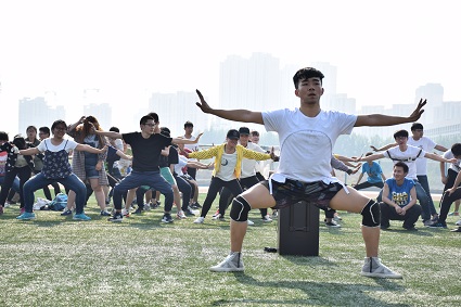 极富节奏感的音乐响起,同学们在舞蹈老师的带领下开始了热身训练。纵使骄阳似火,但同学们的热情更加火热,拉伸,跳跃加强了同学们的身体协调性。扎马步,平板支撑体现了大学生坚持不懈的精神。随着身体的舒展,舞蹈老师们开始教授动感十足的舞蹈动作,传达出了舞蹈的魅力,用舞步诠释了生命的价值。