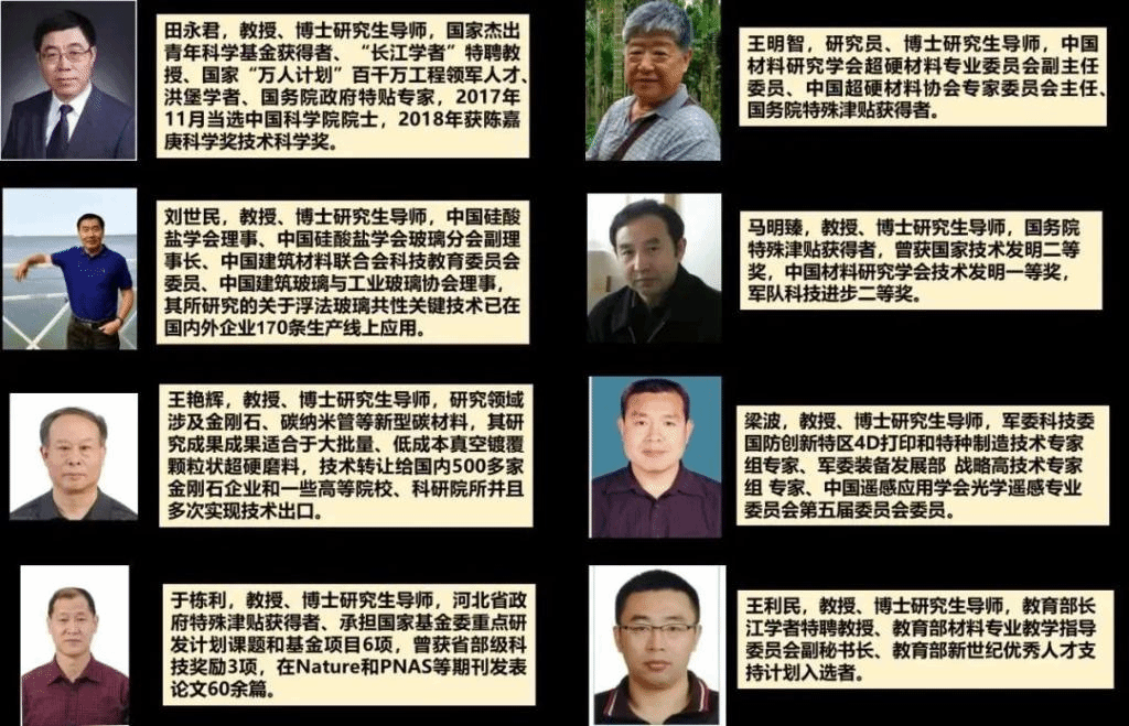 无机非金属材料专业田永君院士团队,经过多年潜心研究,合成出硬度两倍于天然金刚石的纳米孪晶结构金刚石块体材料,创造了超硬材料硬度的世界纪录,相关成果发表于2013,2014和2020年国际顶级期刊《Nature》杂志,引领了超硬材料科学研究,为大幅度提高材料的硬度指明了全新的发展方向,有望进一步推动机械加工业和高压科学等领域的技术变革。