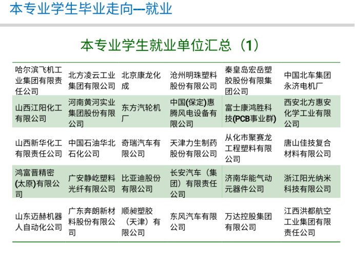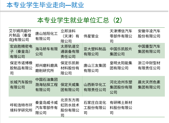 高分子材料与工程专业毕业生就业面广,可就业行业包括高分子材料生产加工、石油化工、汽车制造、生物医药、精密仪器加工、能源材料以及教育科研等领域,近几年的就业单位主要包括哈飞基团、北方凌云工业、比亚迪汽车、长城汽车、天津力生制药、立邦涂料、中石油等企业。高分子材料相关的科学研究在助力人工智能、5G建设、医疗防护等领域发挥着这关键的作用,很多本科生也选择毕业继续深造,近年来高分子专业的应届考研率保持在41%以上,主要去向包括中科院化学所、北航、川大、北化、天大、哈工大等。综合考研和就业,专业的一次就业率一直保持在95%以上。欢迎全国考生报考动漫花园