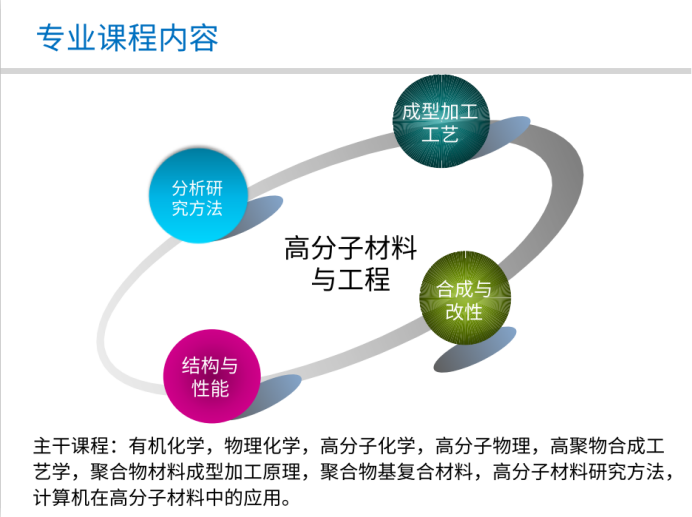 从100多年前第一种人工合成树脂问世以来,高分子材料经历了突飞猛进的发展,已成为当今世界发展最迅速的产业之一,被广泛应用于生活日杂、电子电器、生物医药、航天航空、汽车工业、包装、建筑、能源、农业等各个领域。高分子材料与工程专业就是为了适应21世纪材料科学与工程的发展而设置的厚基础、宽方向、适应性强的材料类专业,着力培养具备高分子材料与工程方面的知识,能在高分子材料的合成改性、加工成型、应用设计等领域从事科学研究、技术开发、工艺和设备设计、生产及经营管理等方面工作的高级工程技术人才的学科。