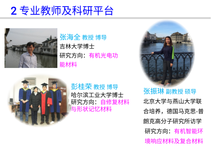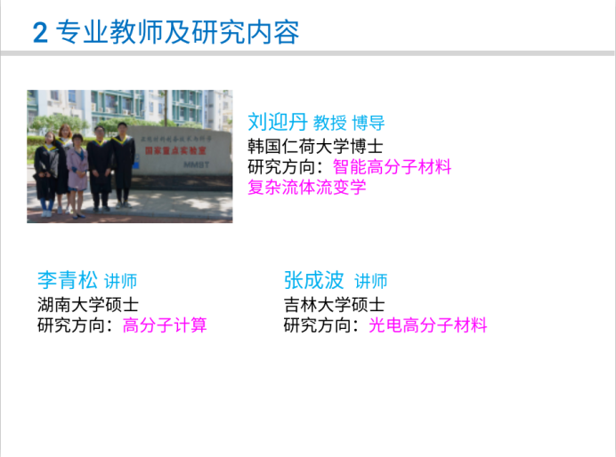 高分子材料与工程专业拥有专任教师8人,其中拥有高级职称教师5人,拥有博士学位教师6人。