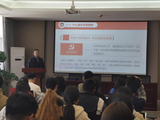 张新宇教授从什么是科学家精神、弘扬科学家精神的意义、学院科研工作者有为担当,服务大国“奇材”和当代大学生如何弘扬和践行科学家精神四个方面展开介绍。通过对钱学森、邓稼先、袁隆平等科学家们心系祖国和人民,不畏艰难,无私奉献的具体事例介绍,引导同学们深刻理解和领悟科学家精神以及弘扬科学家精神的重大意义。随后,从学院科研工作者如何弘扬科学家精神,并落实到攻坚核心技术的科研实践上展开介绍。他们聚焦国家重大战略需求,合成出世界上“最硬”的材料,研发出成功应用于天宫号等航天任务的防护材料,研究成果助力港珠澳大桥、高铁提速等国家重大工程,让同学们深刻领会了老师们的有为担当。最后,就如何更好的弘扬科学家精神向同学们提出了几点要求:在攻坚克难中铸就胸怀祖国、勇攀高峰的信念;在潜心研究中升华追求真理、淡泊名利的品质;在接力奋斗中凝结集智攻关、甘为人梯的自觉。希望大家能够做到:坚定方向,提高自身的专业素养,全心全意为人民服务。