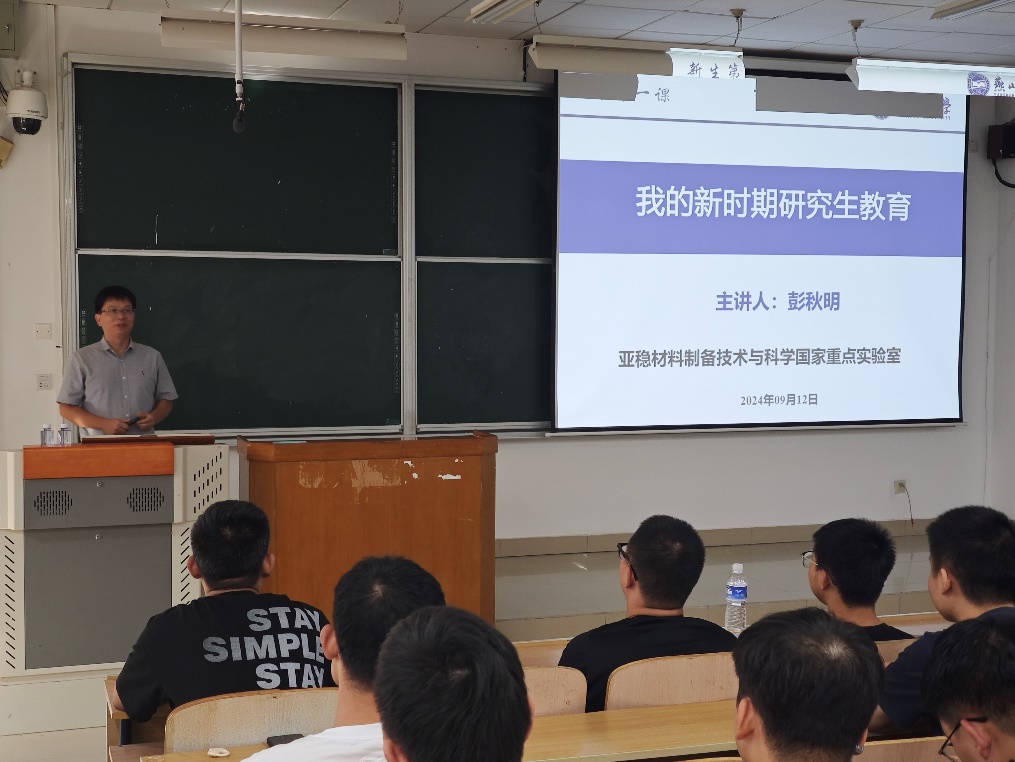 于9月12日下午在西区第二教学楼108室举办2024级研究生“新生第一课”专题讲座。本次讲座由亚稳材料制备技术与科学国家重点实验室常务副主任彭秋明教授主讲,学院党委副书记王亦晨、研究生辅导员和研究生新生一起参加并聆听了本次讲座。讲座由2024级研究生辅导员范学美主持。
