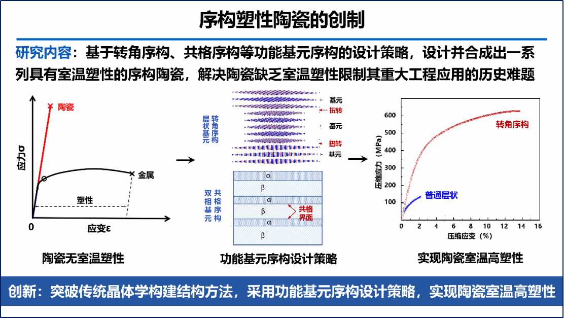 作为牵头单位,北京科技大学、清华大学以及中国科学院金属所联合承担。项目针对陶瓷缺乏室温塑性限制其重大工程应用的历史性难题,拟基于“基元-序构”的结构设计策略,创制出一系列具有室温高塑性的陶瓷材料,并进一步揭示其功能基元和序构方式的形成规律,以及对陶瓷强塑性的影响机制,发展出一系列中国原创的序构塑性陶瓷材料,形成拥有自主知识产权的核心制备技术,最终实现大尺寸序构塑性陶瓷的制备、加工和重大工程应用。
