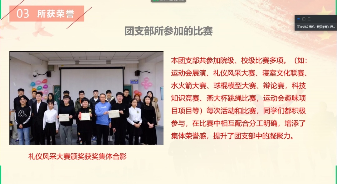 本次大赛弘扬了以热爱祖国、积极创新、探索科学为主的五四精神,深入贯彻落实了习近平总书记系列重要讲话精神,增强了团支部对团员青年的吸引力、凝聚力和教育力,加强了各团支部间的交流和组织文化建设。同时以风采大赛为契机,用实际行动献礼百年校庆、激励青年大学生,营造了青春激扬、奋发拼搏的校园氛围,为校园文化建设、学风建设形成了良好的舆论环境和内生动力。
