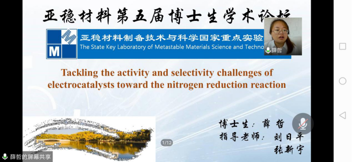 副院长赵元春教授、亚稳材料制备技术与科学国家重点实验室、国家杰出青年基金获得者温斌教授、金属系杨庆祥教授、无机系刘世民教授、材料物理系温福昇教授担任专家评委。学院副处级辅导员王亦晨、综合办公室正科级秘书吕剑钊、综合办公室曹海要、研究生辅导员王妍出席参加本届论坛,学院各学科专业60余名博士研究生通过线上会议平台进行观摩学习,15名博士研究生进行全英文学术汇报、分享科研成果。