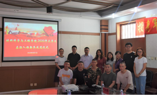 2020年大学生应征入伍新兵欢送会在材料A馆325室举行。本次欢送仪式由学院副处级辅导员王亦晨主持,学院党委书记李曦达、院长王利民、金属材料工程系主任李艺君、金属材料工程系党支部书记冯士东、无机非金属材料工程系党支部书记于凤荣、高分子材料工程系主任彭桂荣以及学院学生工作办公室部分辅导员、在校的预备入伍学生以及学生代表出席本次欢送会。