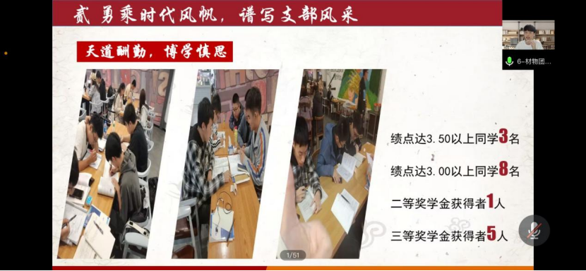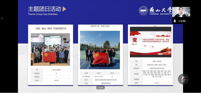 在风采展示环节中,各支部从政治理论学习情况、支部成员荣誉、特色团日活动、支部未来展望等角度,展示了各团支部积极向上、不断拼搏创新的精神及对母校的热爱之情,在实践中让五四精神、中国精神绽放更加夺目的新时代光芒。在比拼中激励了同学们加强基层团组织建设、继续发扬奋斗精神、以实际行动为共产主义青年团贡献自己的一份力量的决心。