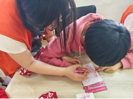 在母亲节贺卡创作区,五彩斑斓的卡纸化作情感载体。彩色的卡纸、闪亮的贴纸、五彩的画笔……在志愿者的引导下,孩子们充分发挥自己的想象力和创造力,用双手描绘出对母亲的爱与祝福,或许笔迹略显粗糙与稚嫩,但饱含着“星星的孩子”对母爱最本真的理解而熠熠生辉。