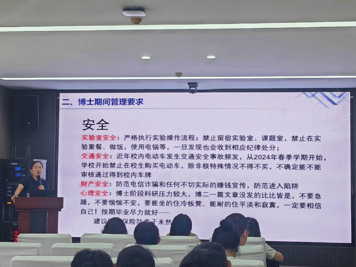 校园制度是保障学校正常运转和学生健康成长的重要准则。两名辅导员详细解读了学校、学院的各项规章制度,包括综合测评、学术诚信、请假管理规定、奖助学金评定等方面。提醒新生在科研过程中要严格遵守学术规范,杜绝抄袭、剽窃等学术不端行为。实验室安全是科研工作的重中之重。两位辅导员提醒新生在进入实验室前要接受系统的安全培训,熟悉实验室的环境和设备,严格遵守实验室的安全管理制度,做好个人防护措施。随后,两位老师详细解读学校公寓管理规定,强调宿舍安全的重要性,提醒新生注意用电安全、消防安全,不使用违规电器,保持宿舍整洁卫生。