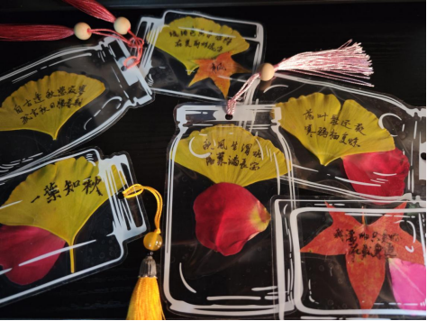 随后的落叶书签制作环节,他们充分发挥自己的想象力和创造力,对落叶进行精心地修剪。有的将落叶修剪成爱心形状,寓意着对大自然的热爱;有的则在落叶上写下自己的梦想,为落叶注入了蓬勃的梦想力量。每一片落叶在他们的手中都仿佛被施了魔法,变成了一件独一无二的艺术品——特色书签。