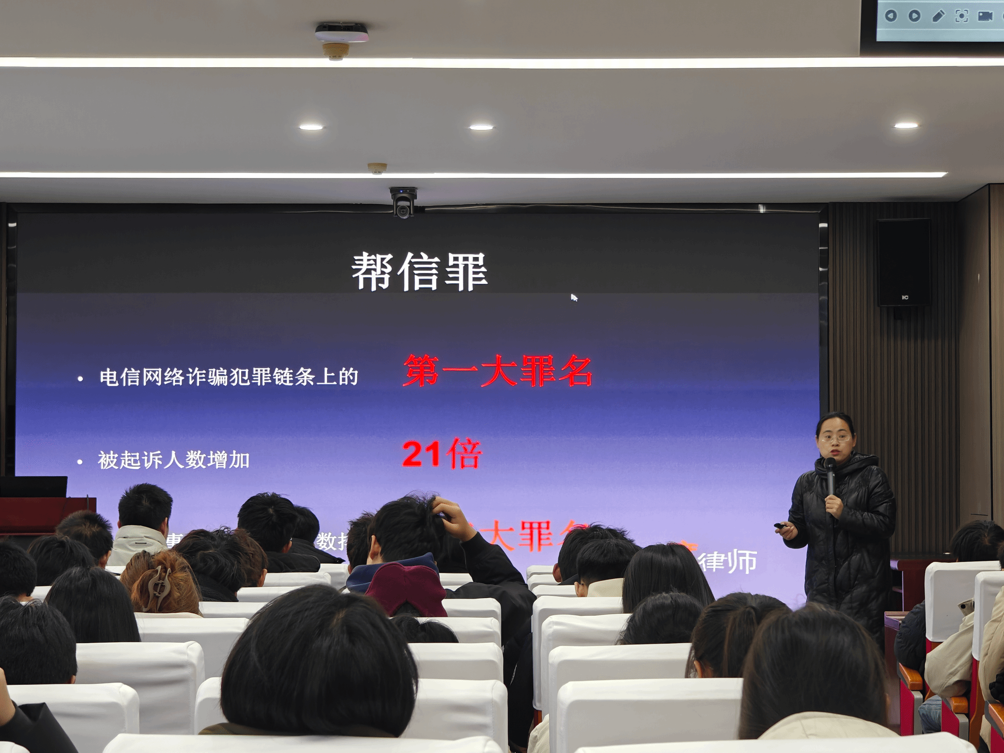 高律师通过案例讲解、法律科普、现身说法等方式,让大家认清了大学生常见骗局的隐蔽套路,深刻认识到“帮信罪”的法律红线,有效提升了同学们的风险防范意识和自我保护能力,推动反诈知识入脑入心。