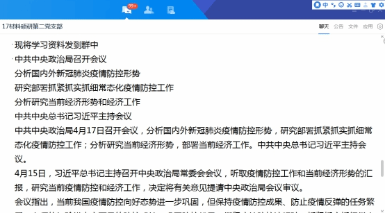 硕士研究生第二党支部于4月20日开展了学习贯彻习近平总书记主持召开的中共中央政治局常委会会议和中共中央政治局召开会议精神的专题学习会,深入了解了国内外新冠肺炎疫情防控形势和当前经济形势,深入学习了疫情防控和当前经济的部署工作。