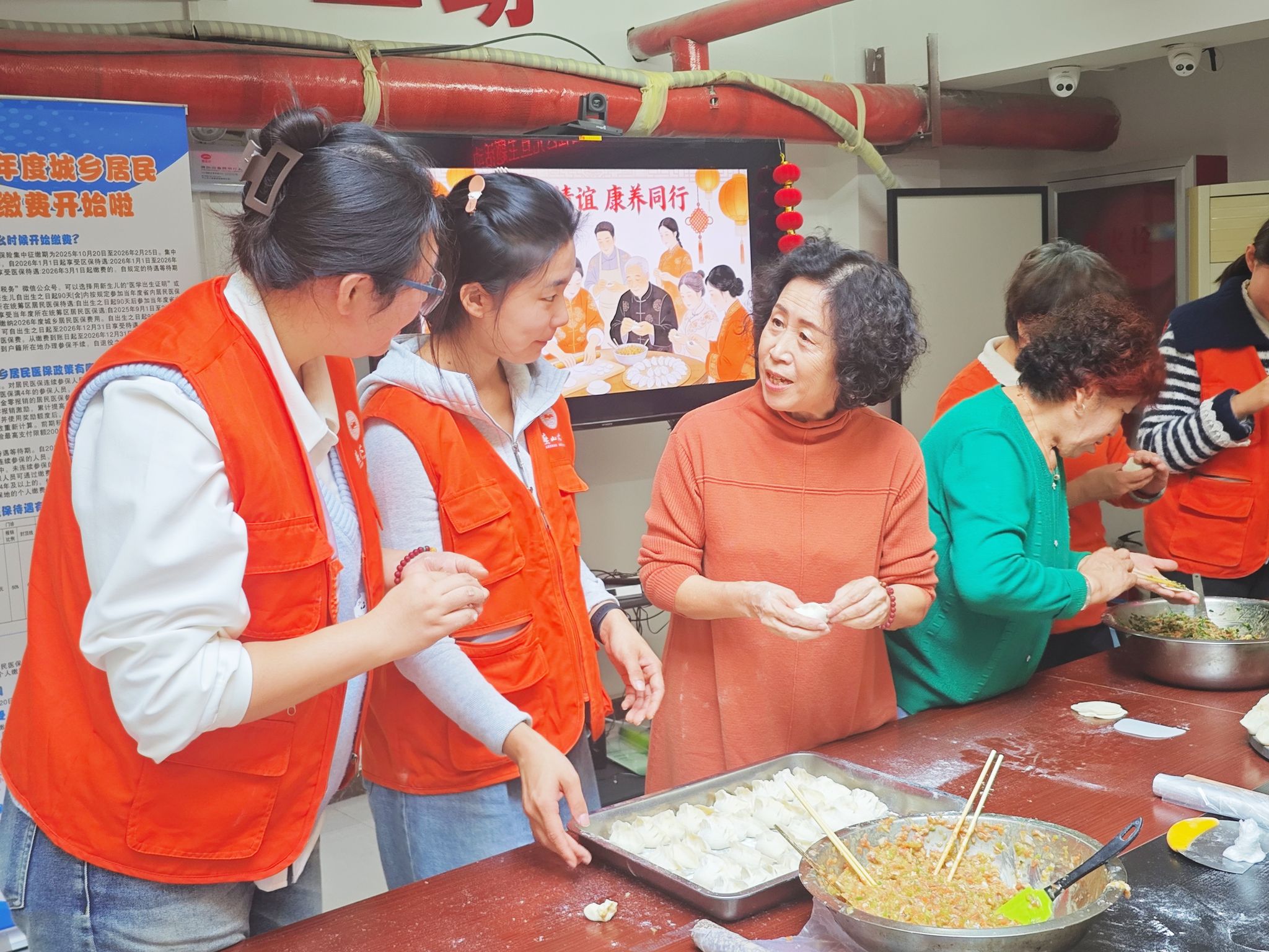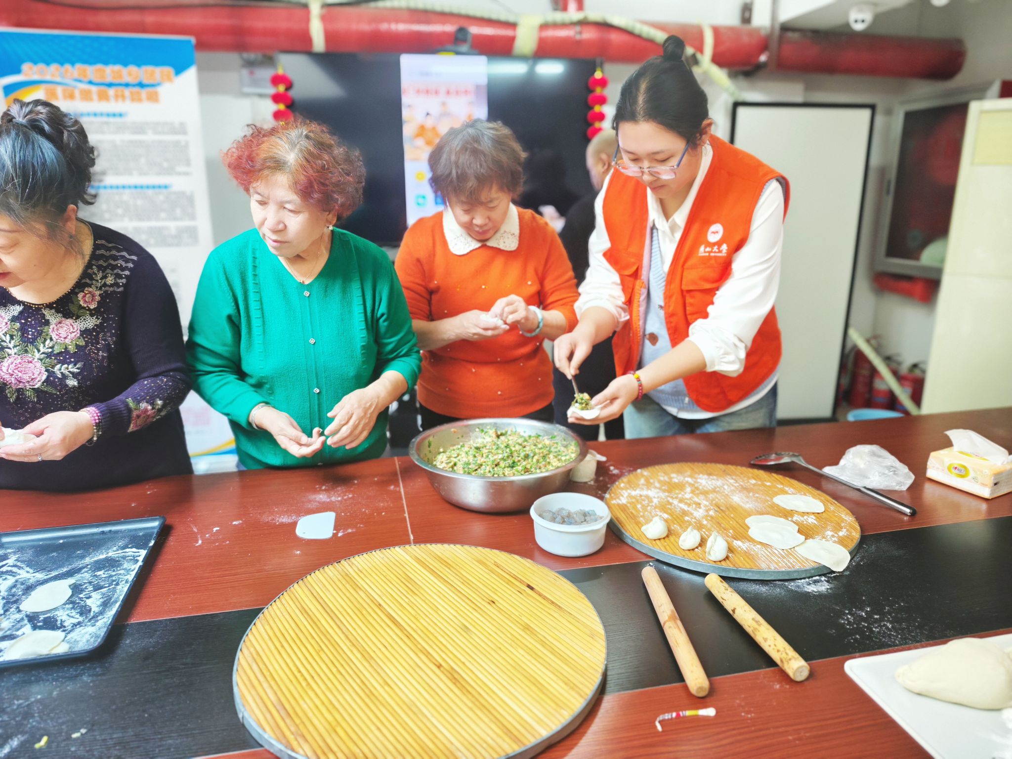 活动伊始,社区邀请的中医院专家团队为社区居民提供了免费义诊服务。作为志愿者,同学们协助维持现场秩序,引导居民有序就诊,展现了良好的服务精神。随后,同学们与社区居民一起动手包饺子,共同迎接新年的到来。活动现场欢声笑语,大家纷纷展示自己的包饺子技艺,一个个饺子在手中诞生,象征着团团圆圆、和和美美。同学们与社区居民边包饺子边聊天,分享生活中的点滴趣事,气氛温馨融洽。随后,大家齐心协力煮饺子,当热气腾腾的饺子端上桌时,满屋飘香,居民们品尝着亲手制作的饺子,脸上洋溢着幸福的笑容。